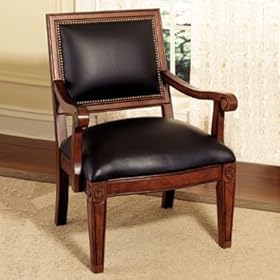 This stately accent chair exhibits a blend of Italian provincial and late American colonial design influences, featuring hand carved medallions, carved tapered legs, sweeping scroll arms and hand applied antique brass nail head trim, all covered in a lightly distressed deep cherry finish. Lightly Distressed "Deep Cherry" Finish with Black Leather. A comfortable chair with a solid wood frame, sinuous arc springs, polydacron wrapped back and seat cushions, covered in rich brown leather. Some assembly required. This furniture item requires assembly. Complete assembly instructions are provided with the unit. Typically only a Phillips head screwdriver and a hammer will be required for assembly. For questions regarding products, order delivery, or returns, please contact AtHomeMart Customer Service. Lowest factory direct price guarantee.